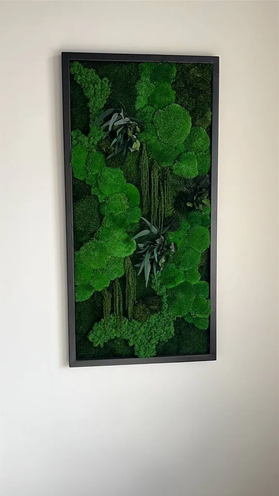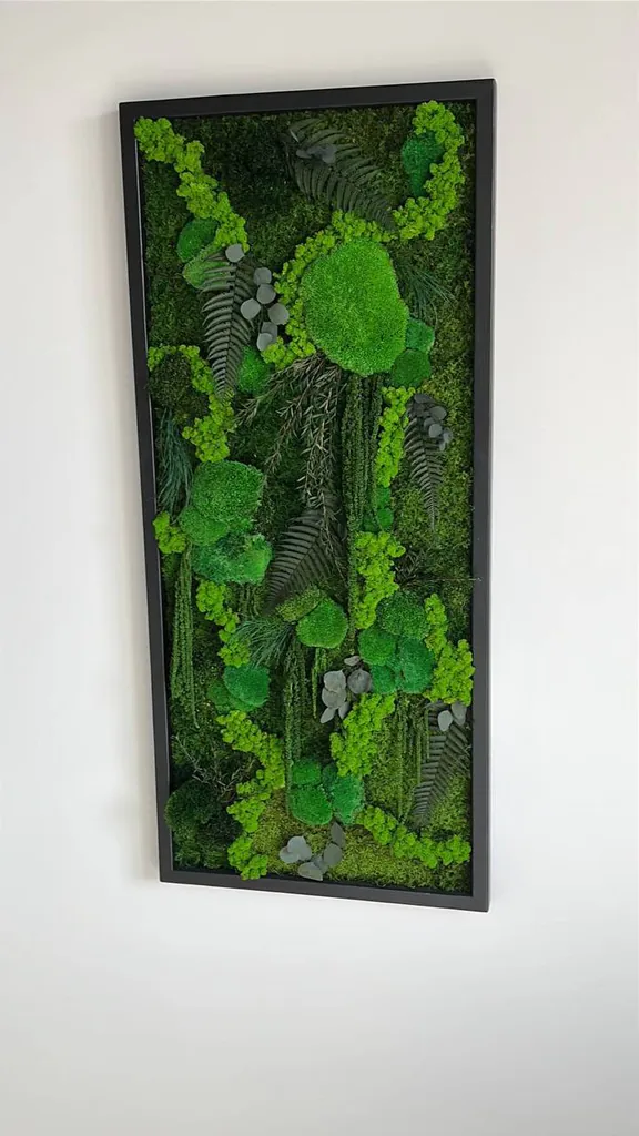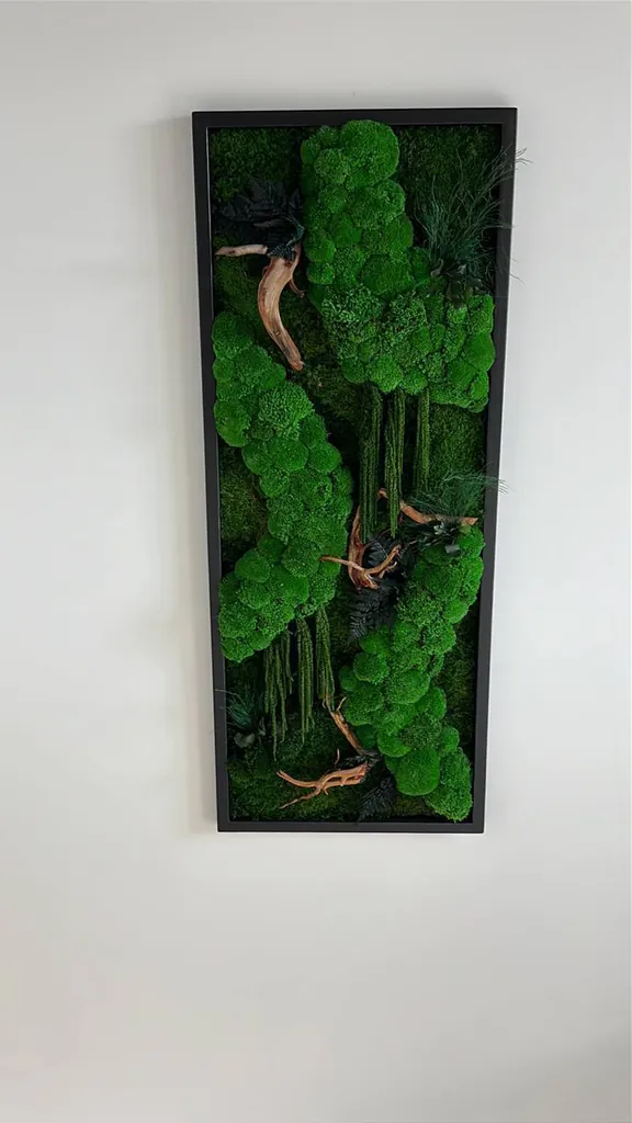 - Stabile Rahmen: Die schlanken, schwarzen Rahmen ergänzen das intensive Grün perfekt und betonen die moderne, geradlinige Form der vertikale Bilder aus Moos.