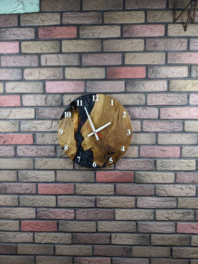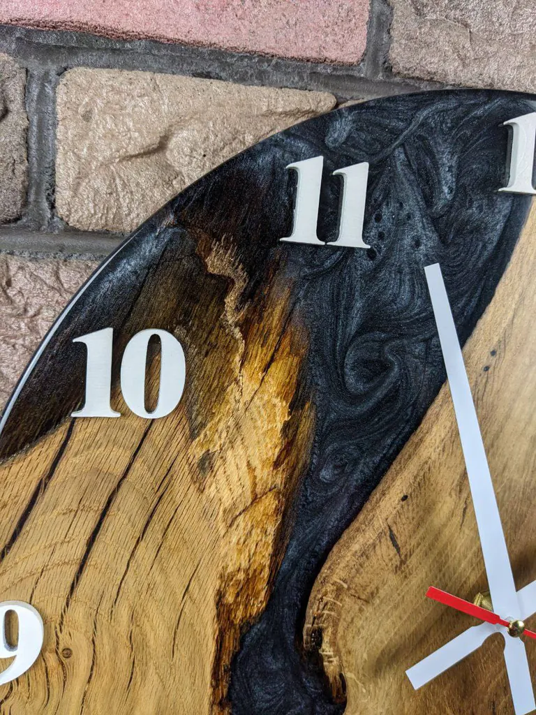 Die schwarze Epoxidharz Wanduhr ist vielseitig kombinierbar und passt sowohl zu modernen Loft-Wohnungen als auch zu klassisch eingerichteten Räumen. Dank des natürlichen Eichenholzes strahlt sie Wärme und Gemütlichkeit aus, während das elegante Schwarz des Harzes mit seinem Perlmutt-Schimmer einen luxuriösen und modernen Akzent setzt.