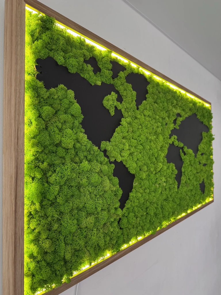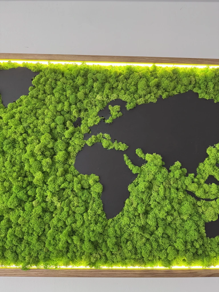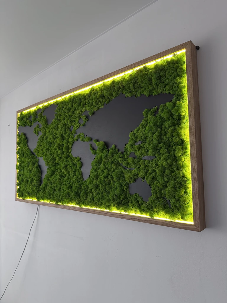 Exklusive Weltkarte aus Islandmoos mit Holzkontinenten und LED-Rahmen