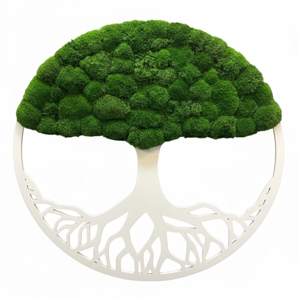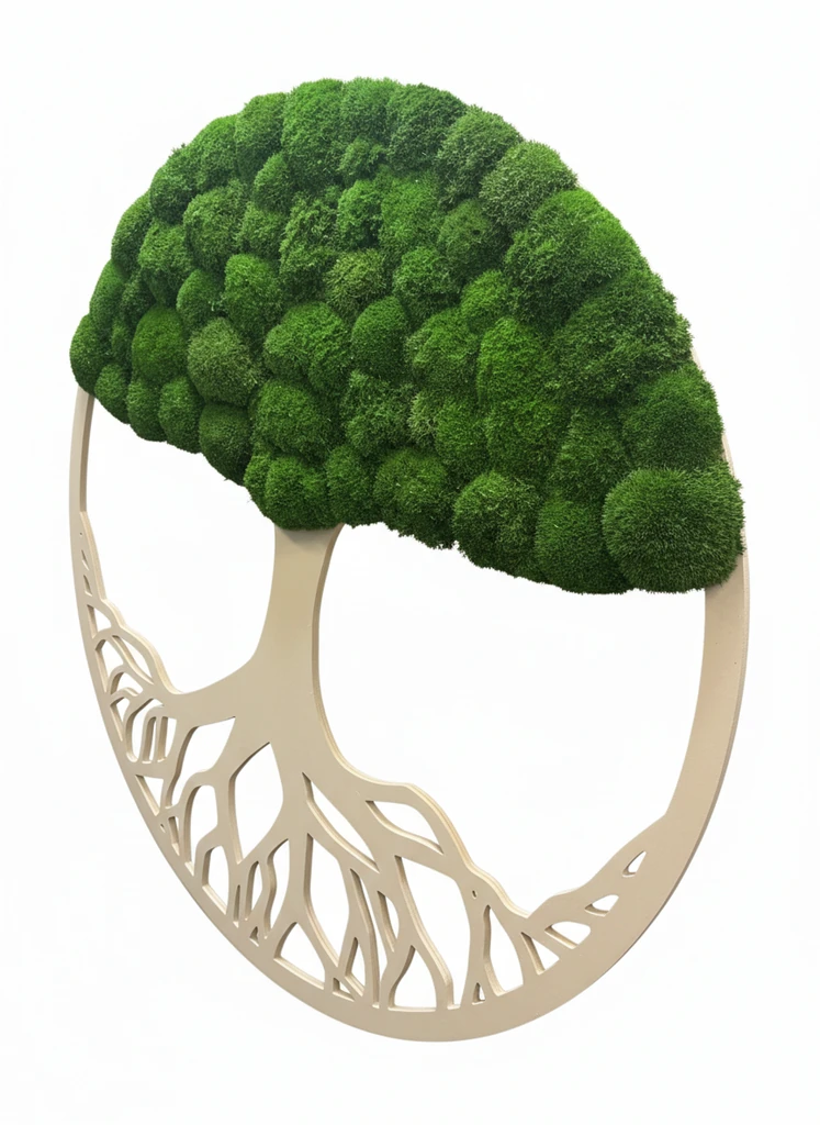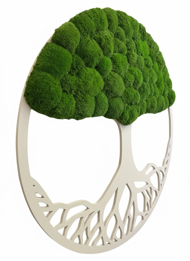 Der Moosbild mit Kugelmoos. Baum des Lebens ist ein wunderschönes Kunstwerk, das eine runde Form hat und aus Holz und Moos besteht. Das Kunstwerk zeigt das Bild eines Baumes, bei dem das Wurzelsystem, die Krone und die Äste kreisförmig ausgeschnitten sind.