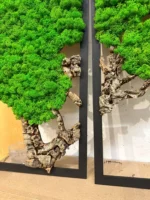 Der „Moosbaum mit Islandmoos und Korkholz“ ist eine dreiteilige Bilderserie, die aus isländischem Moos und Korkholz gefertigt ist. Jedes Teil zeigt ein Stück eines üppigen Baumes mit einem braunen Stamm und Ästen, die mit Korkholz verziert sind, sowie einer prächtigen grünen Krone aus isländischem Moos. Die Gesamtbreite des Sets beträgt 100 cm und die Höhe 67 cm, wenn alle drei Teile nebeneinander angeordnet sind.
