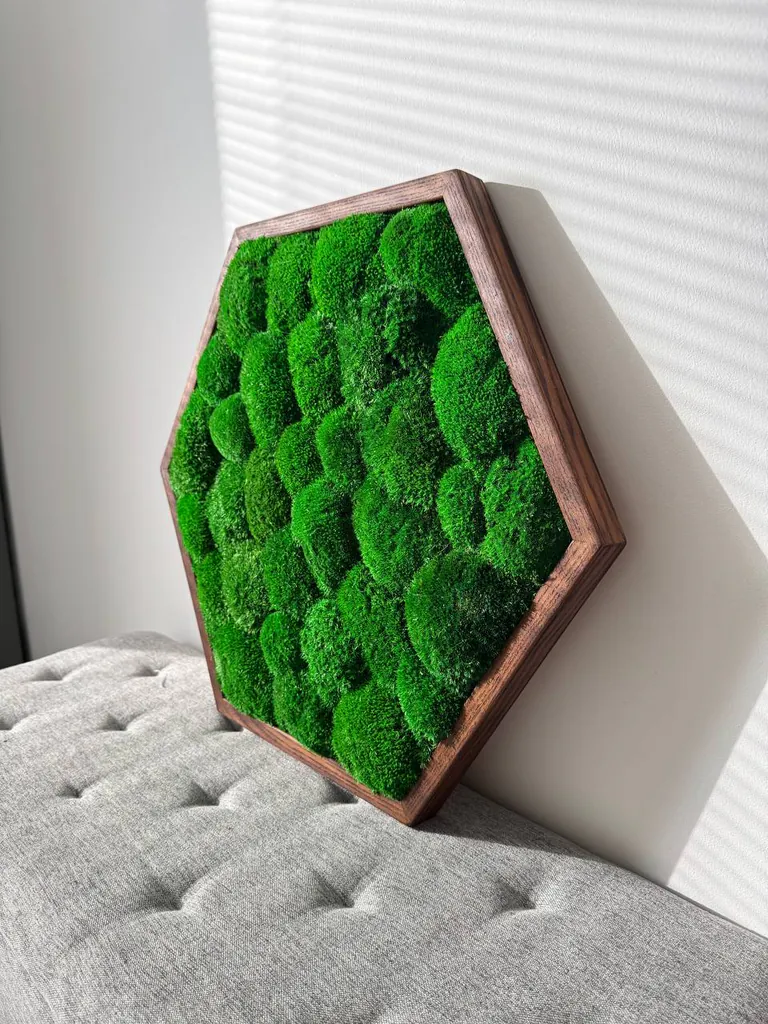 „Moosbild Hexagon mit Kugelmoos“ ist ein faszinierendes Kunstwerk, das durch seine außergewöhnliche Einzigartigkeit und natürliche Eleganz verzaubert. Es präsentiert ein Sechseckbild, das meisterhaft aus stabilisiertem Moos geschaffen wurde, um eine originelle künstlerische Darstellung zu bieten.