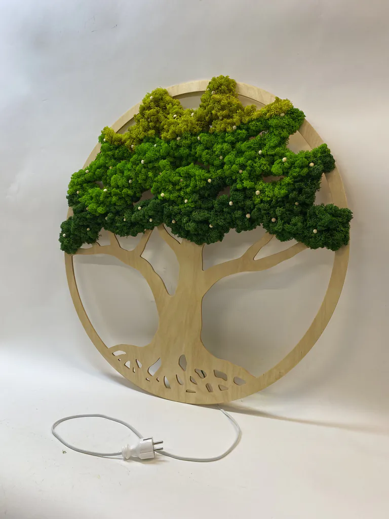 Um einen beeindruckenden „Wow“-Effekt zu erzielen, wurde auf der Rückseite des Moosbildes LED-Beleuchtung eingebaut, die mit 220 Volt betrieben wird. Dies verleiht dem Bild eine besondere Leuchtkraft und macht es zu einem Blickfang in jedem Raum.