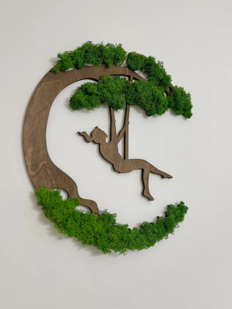 Mooskunst Silhouette: Mädchen auf Schaukel – Kunst mit Moos