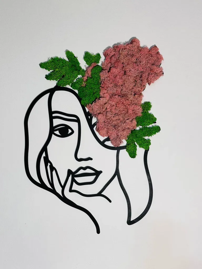 Das Porträt besteht aus hochwertigem, 6 mm dickem Sperrholz, das mit einer feinen Lasertechnologie präzise ausgeschnitten wurde. Die Silhouette zeigt das Gesicht einer Frau, deren Kopf in einem harmonischen Zusammenspiel von grünem und zart rosa gefärbtem Moos gestaltet ist. Dieses lebendige und natürliche Material bringt Farbe und Frische in Ihre Einrichtung, während es gleichzeitig ein zeitgemäßes und stilvolles Statement setzt.