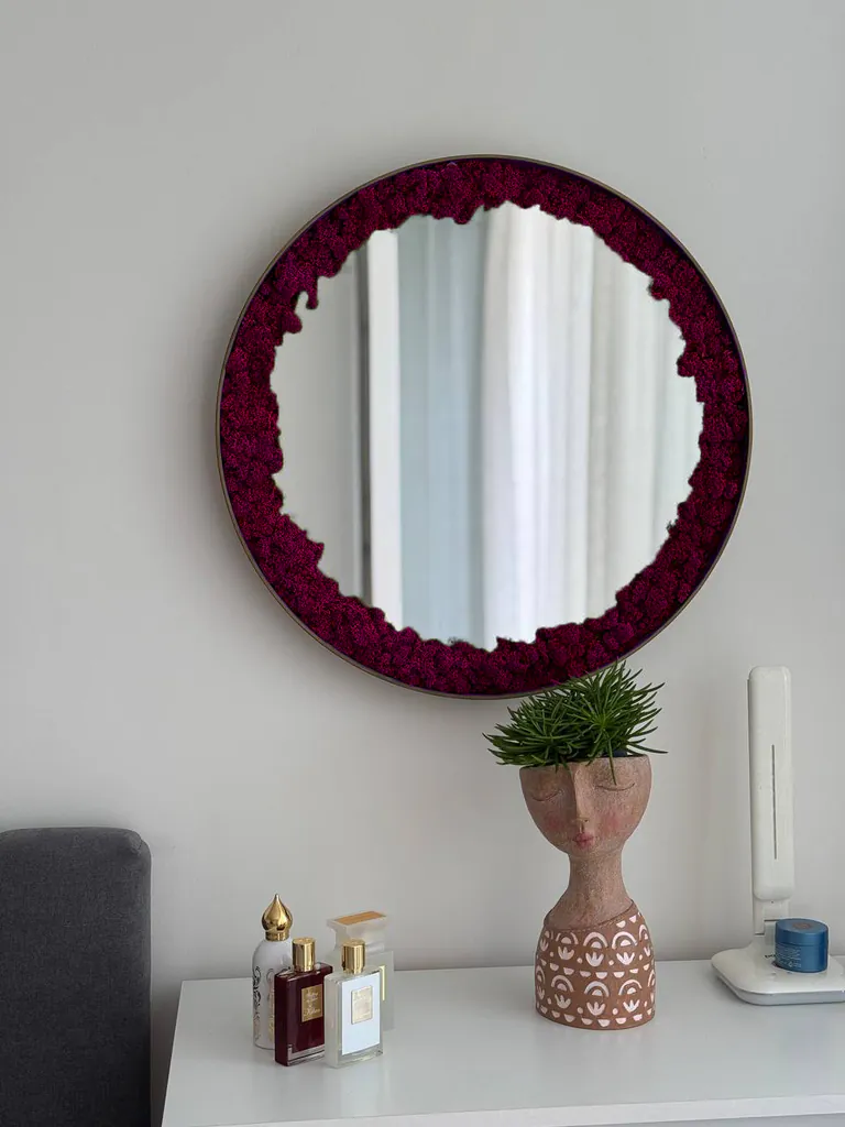 Neben seiner dekorativen Wirkung bietet der Spiegel praktische Vorteile: Er vergrößert optisch den Raum, reflektiert Licht und schafft eine offene, freundliche Atmosphäre. Der dezente Moosrand verleiht ihm dabei einen natürlichen Charakter, der Ruhe und Ausgeglichenheit ausstrahlt.